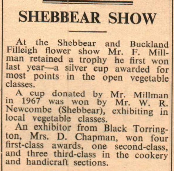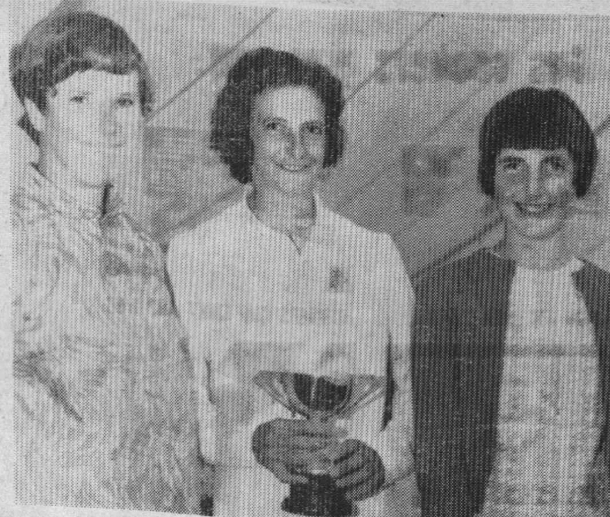 This triumphant trio virtually swept the board in the handicraft section of Woolsery Show. In the centre with the President’s Cup for most points, is Miss Margaret Allin, of Putford. On the right is 12 year old Gillian Raffe, of Woolsery, who gained most points in the children’s classes, and on the left 14 year old Rosemary Lot, also of Woolsery, who was runner-up.