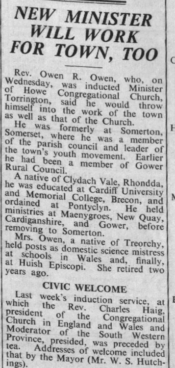 Rev Owen R Owen was inducted Minister of Howe Congregational Church, Torrington.