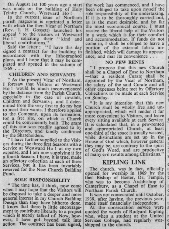 How Westward Ho! got its church. On August 1st 1868 a start was made on the building of Holy Trinity Church. Although the Church officially opened for worship in 1869, it was not consecrated until 1938.