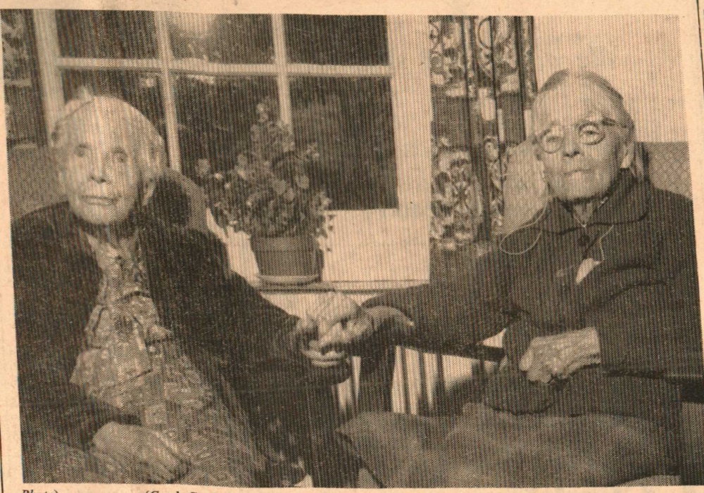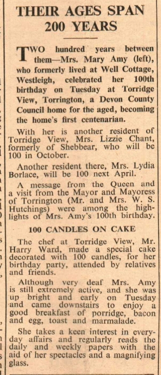 Mrs Mary Elizabeth Amy, formerly of Well Cottage, Westleigh, celebrates her 100th birthday at Torridge View Welfare Home. It is hoped that Mr Sidney Trick, a niece and friends will attend the party. Mrs Chant, who lived at Holroyd Cottage, Shebbear, is 100 in October but Mrs Lydia Borlace is not quite as old as originally thought.