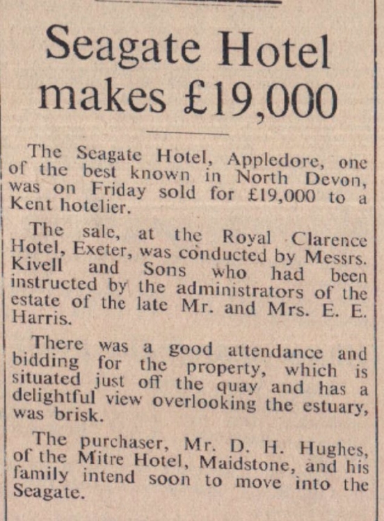 The Seagate Hotel, Appledore, is sold for £19,000 to a Kent hotelier, Mr D H Hughes.
