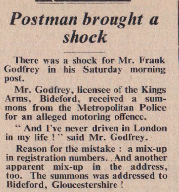 A shock for Mr Frank Godfrey, licensee of the Kings Arms, Bideford.