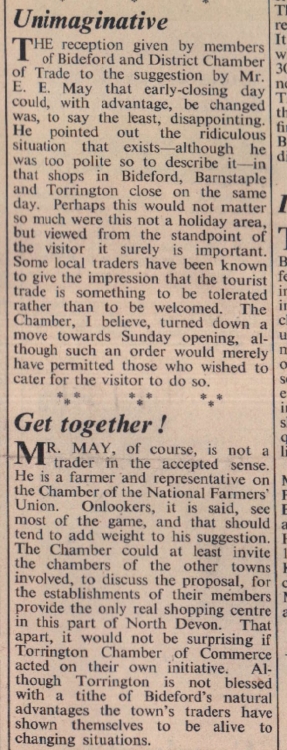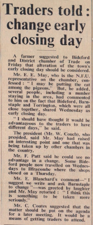 Mr E E May, NFU representative on the Bideford and District chamber of Trade suggests a change to early closing day, though Mr F Patt and Mr E Blanchard aren’t in favour.