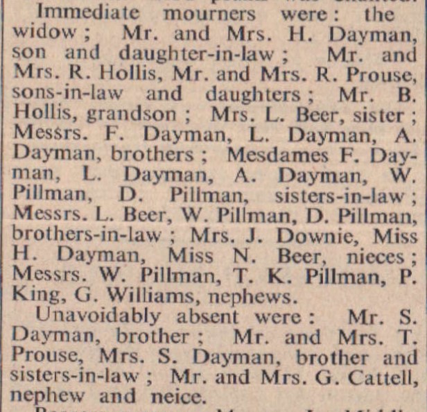 The funeral of Mr Charlie Dayman, of Mount Pleasant, Hartland, took place at St Nectan’s Church, Hartland. The Vicar, Rev A T H Jones, officiated and Mrs Jones accompanied the hymns. Bearers were Messrs L Middle, A Thorne, D Newton, L Webber, E Johns and L Beer. There was a large attendance.