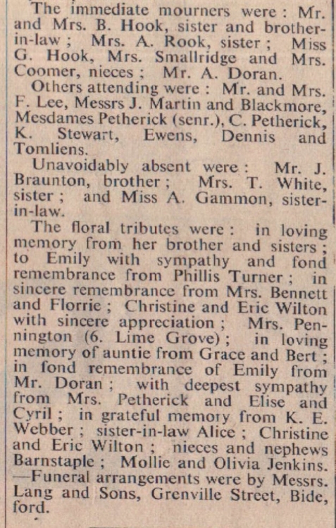 The funeral has taken place at Instow Church of Mrs Emily Gammon, wife of the late Mr C C Gammon, of 5 Lime Grove, Bideford. She was 83. The Rector of Instow, Rev H L Hustwayte, officiated. Funeral arrangements were by Messrs Lang and Sons, Grenville Street, Bideford.