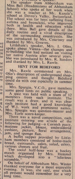 For the first time two local Women’s Institutes have shared their monthly meeting and in addition Mrs Earle and Mrs Spurgi, both Voluntary County WI Officers, attended. Littleham invited Abbotsham WI to their Village Hall and were welcomed by Mrs D Hill.