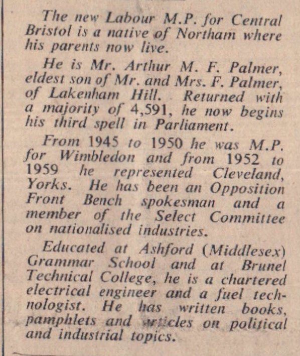 A native of Northam, Mr Arthur M F Palmer, is the new Labour MP for Central Bristol, His parents live at Lakenham Hill.