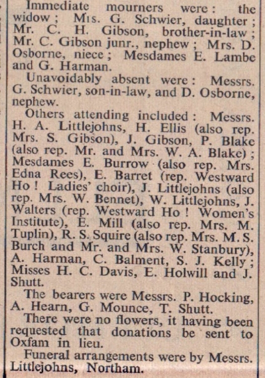 The funeral of ex-Police Sergeant Ernest Victor Barnacott, who served in Devon Constabulary, took place at Abbotsham Parish Church. Mr Barnacott, who was 72 and a widower, lived at Homesworthy, 9 Northdown Road, Bideford. He was a member of an Abbotsham family and his father had been a policeman there. The Vicar of Abbotsham, Rev E G Bevan, officiated and interment took place in Hatherleigh churchyard.