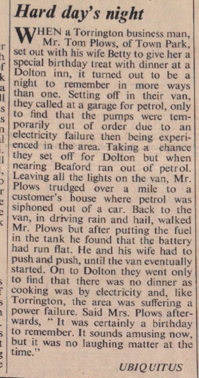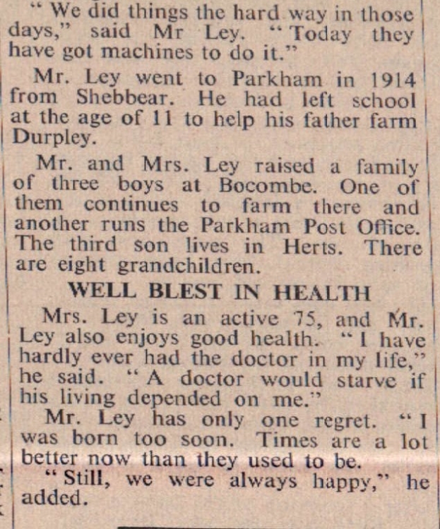 A man who once thought himself a confirmed bachelor celebrated 50 years of happy married life. Mr Arthur Ley, now 85, remained single until he was 35. Then he met Miss Hetty Martin, whose mother then ran the Post Office at Parkham, where Mr Ley, a ‘newcomer’ to the district, regularly called. The romance blossomed and at Parkham Methodist Church on October 22nd 1914, Arthur George Ley married Hetty Martin. They farmed 100 acres at Bocombe Farm from 1914 to 1943, when they moved, in retirement, into the village.
