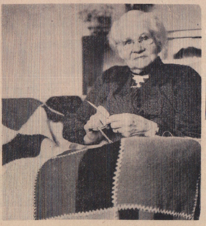 Ninety-five year old Mrs Mary Mills knitted all the squares for a patchwork bedcover, which Torrington Women’s Institute are giving to their ‘adopted’ displaced family. Mrs Mills is the mother of Mrs Hedley Bowden, a former president of the institute, with whom she lives in New Street. The sections have been sewn together by Mrs Cole.