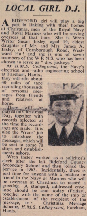 Local girl DJ. Wren Writer Susan Insley, eldest daughter of Mr and Mrs James A Insley, of Cornborough Road, Westward Ho! is one of seven members of the WRNS who has been chosen to serve as ‘disc jockeys.’