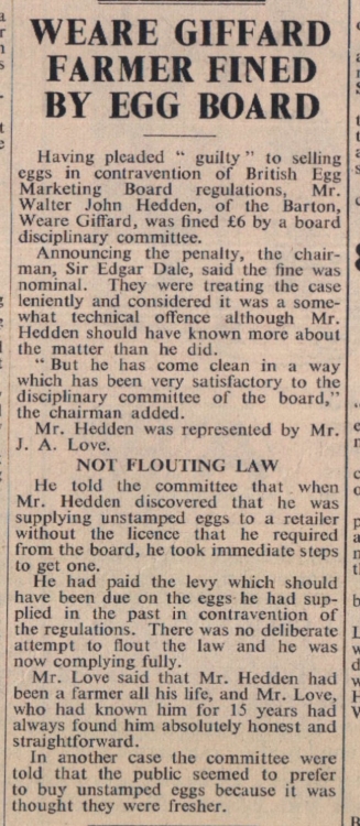 Mr Walter John Hedden, of the Barton, Weare Giffard, was fined £6 for selling eggs in contravention of British Egg Marketing Board regulations.
