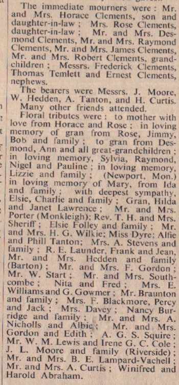 The funeral has taken place at Weare Giffard Church of Mrs Mary Ann Clements, wife of the late Mr Frederick Clements, of Weare Giffard. She died in the Torridge Hospital, aged 88. The Rev M Coyle officiated and Mr D Glover, the organist, accompanied the hymns.