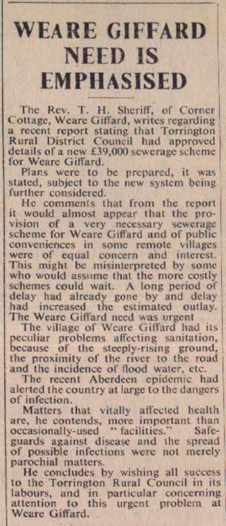 £39,000 sewerage scheme for Weare Giffard, and similar facilities are needed at Shebbear. In a later article, the Rev T H Sheriff, of Corner Cottage, Weare Giffard emphasised the need.