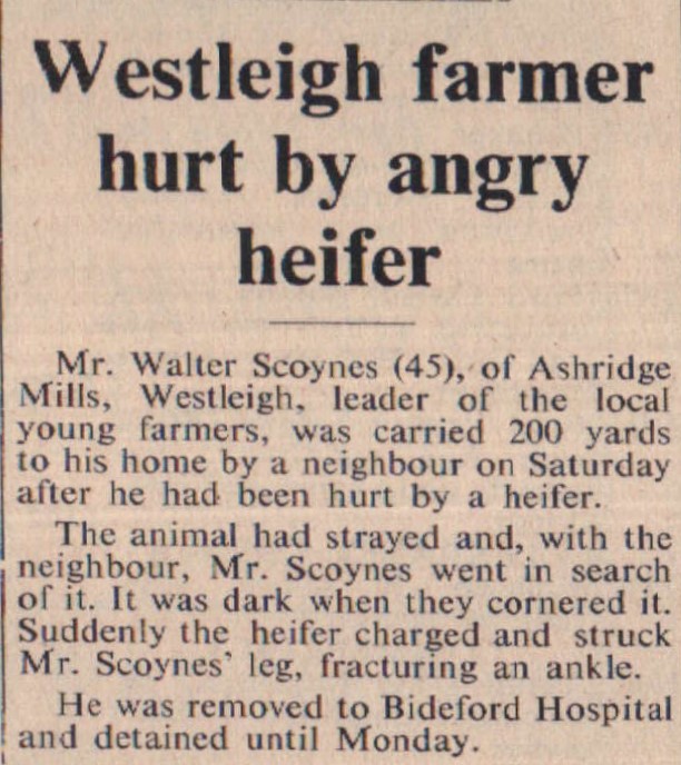 Mr Scoynes of Ashridge Mills, Westleigh, is hurt by angry heifer.
