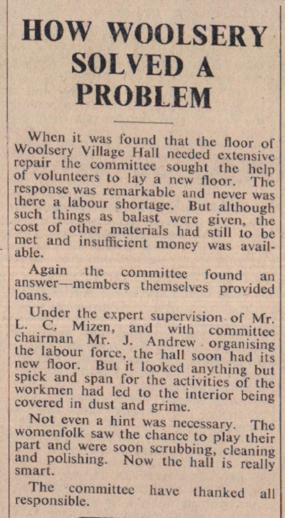 With Mr L C Mizen, Mr J Andrew and womenfolk, Woolsery Village Hall solves a problem.