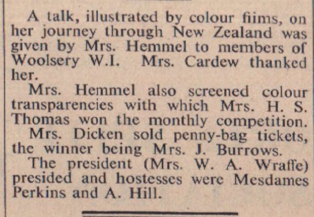 All Hallows Church, Woolsery, was lavishly decorated for harvest thanksgiving by Miss V Cook, Mrs C Perkins and Mrs J Raffe. The morning service was conducted by the Rev R O H Eppingstone, rector of Clovelly, and that in the evening by the Rural Dean, Rev Roy Dixon. A further service again conducted by the Rev R O H Eppingstone, was followed by supper in the Church Rooms. Responsible for the catering were Mesdame F Knight, C Perkins, G Bailey, N Gorrell, J Andrew, J Raffe, R Peard and Miss V Cook. The last named was organist throughout the festival at which a total of £29 9s 9d was raised.