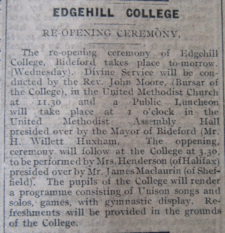 The re-opening ceremony of Edgehill College, Bideford, took place and a striking sermon – The Altar and the Temple - was preached by Rev J Moore. This saw the realisation of the first portion of the rebuilding scheme – the main educational block - after the disastrous fire which gutted the College two years ago. The second part – the erection of a spacious assembly hall, main entrance hall, domestic science room, etc. at the old Villa End – will not be undertaken until financial position justifies. More about the history of Edgehill College can be found HERE