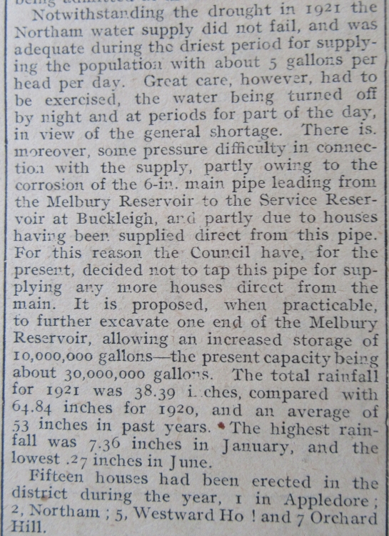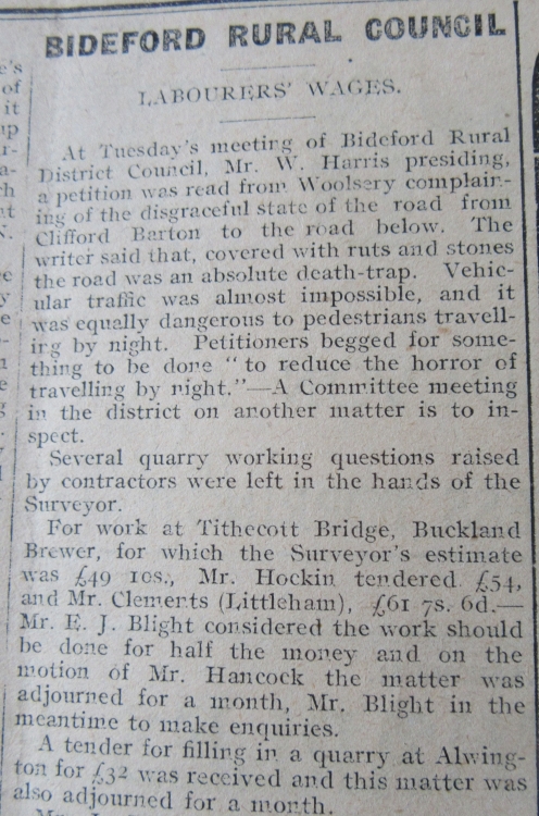 At a Bideford Rural District Council meeting, Woolsery petitions to have ‘an absolute death-trap’ repaired; the work at Tithecott Bridge, Buckland Brewer is delayed because the quotes are too high; the matter of an Alwington quarry is adjourned; Melbury Reservoir will be excavated to increase its capacity; and 15 houses have been erected in the district.