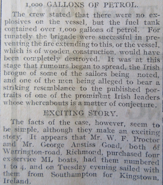 Bideford quayside was the scene of considerable excitement, and became the broadcasting station for a series of mysterious and sensational rumours, which soon spread over the whole town and brought crowds of inquisitive visitors to the river bank. On Thursday evening, a disarmed ML boat, or submarine chaser, sold of the service, came up the river and moored at the Quay. She was observed to have a double crew, and some on board were evidently not sailors. Only three slept on board, the remainder putting up at a hotel. All was quiet when PC Bulgin passed along the Quay at 5.30am but half an hour later, and a shout for ladders, and deckhand McCarthy ran to the nearest fire alarm and called the fire brigade, which was quickly on the scene, under Capt Morris. Harbour-master Prance, who lives almost opposite, was also one of the first on the scene. A big volume of flame was then issuing from the after hatchway. The brigade quickly got two hosepipes playing on this, and succeeded in confining the fire to the wardroom which was completely burned out.