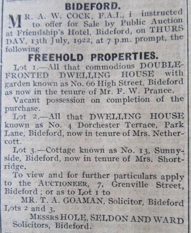 Properties for sale in Bideford – No. 66 High Street; No. 4 Dorchester Terrace, Park Lane; and No. 13 Sunnyside.