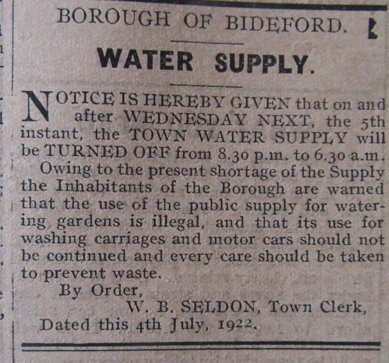 By Order of W B Seldon, Town Clerk, inhabitants of the Borough of Bideford are advised that the Town water supply is being turned off.