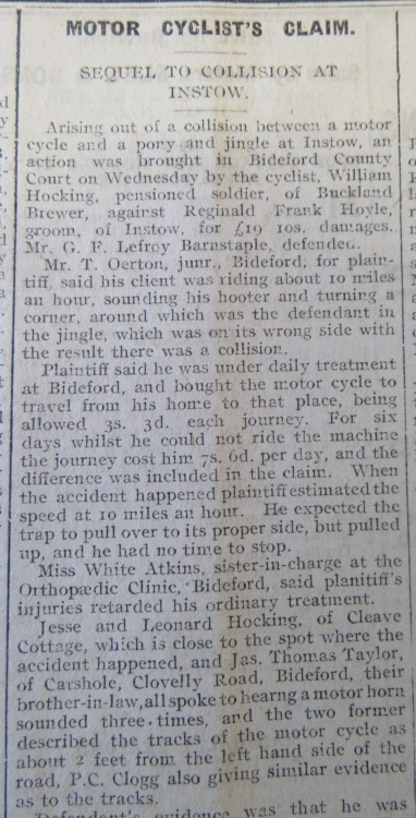 William Hocking of Buckland Brewer brings an action against Reginald Frank Hoyle of Instow.