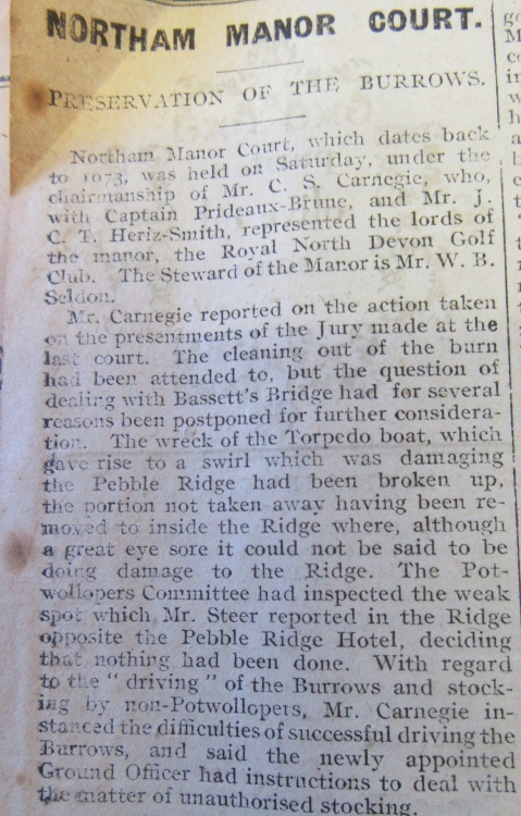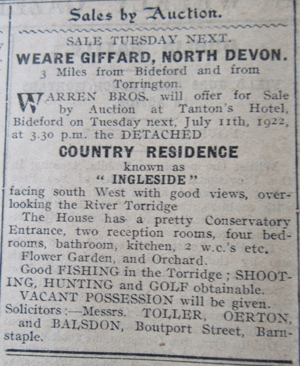 Messrs R Blackmore and Sons conducted a largely attended auction at Tanton’s Hotel for the sale of about 18 acres of accommodation and building land, a part of the Molesworth estate. Unusual local interest was evinced as Lots 1, 2 and 3 comprised about 5 acres the remaining portion of the Pill Marsh on the Bideford side of the Westward Ho! Railway track, where the Bideford Bowling Club have laid out a splendid green. It has frequently been urged that this stie ought to be acquired as a sports ground for the town. There was brisk bidding for the ground when offered in one lot, and a fear that the opportunity of its being secured as a sports field lost. The bidding started at £1,000 and the property was eventually knocked down at £1,470 to Mr A W Lister who we understand was prompted with provisional support, to secure the site for Bideford. It is therefore now open to the sports clubs of the town to formulate a sound scheme and there ought to be no difficulty in the necessary support forthcoming. Lot 4 of pasture land adjoining ‘Hubbastone’ was secured by Mr Dennis at £770. An enclosure of land was secured by Mr Adkin and a portion of the Foreshore and land at the bottom of Limer’s Lane was also secured by him.