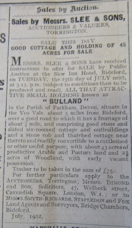 For sale – Bulland, in the Parish of Parkham, a good cottage and holding of 45 acres.