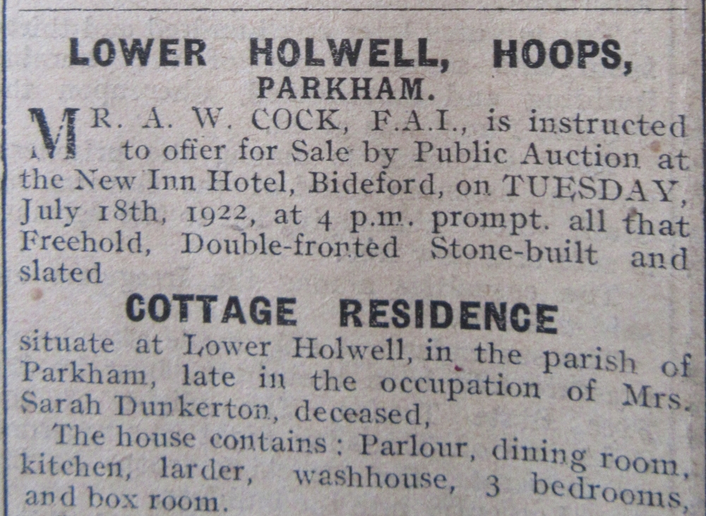 A cottage residence at Lower Holwell, Hoops, Parkham, is for sale. Late in the occupation of Mrs Sarah Dunkerton.