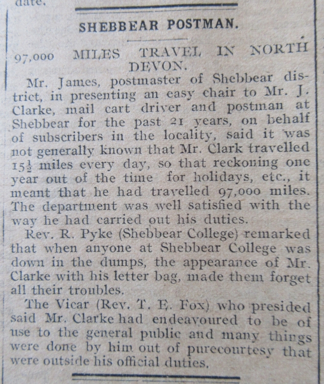 Mr Clark, mail cart driver and postman, travels 97,000 miles in North Devon.