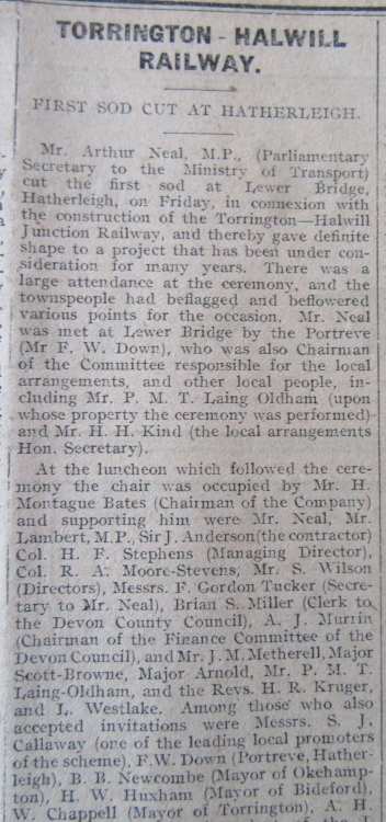 Torrington-Halwill Railway – the first sod is cut at Hatherleigh. Later in the month it was reported that good progress is being made with the foundations for the new viaduct of the Marland Company’s line.