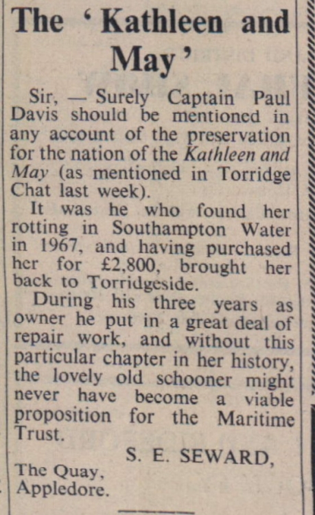 S E Seward is keen to ensure that Captain Paul Davis should be credited with preserving the Kathleen and May.