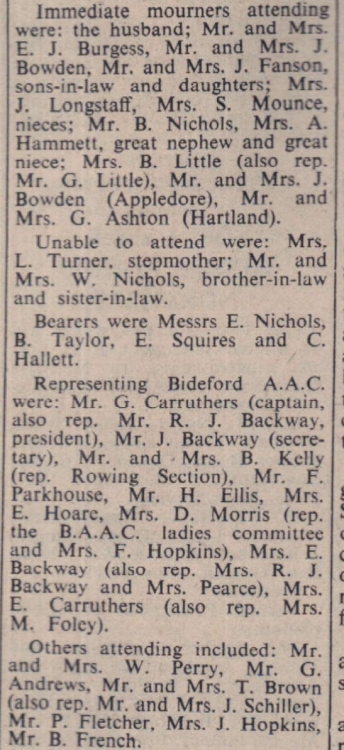Members of Bideford Amateur Athletic Club’s football section were bearers at the funeral of Mrs Dorothy Fisher Nichols, wife of Mr Stanley Nichols, of 25 Elm Grove, Bideford. Mrs Nichols, who was 69, was a staunch worker for and committee member of Bideford AAC. The Rev Martin Fredriksen officiated and Mr Dalby was the organist.