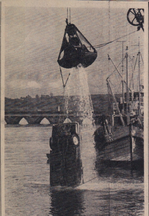 A crane hauls out of the river the car which went over Bideford Quay edge into about eight feet of water. The driver, Mrs Gray, of Venton Drive, Westward Ho! escaped with shock, cuts and bruises. The photograph was taken by a visitor, Mr P Francis of Banwell.