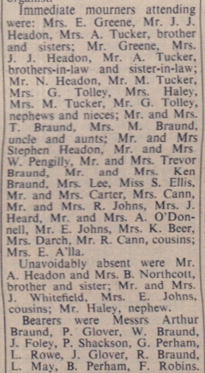 The funeral has taken place at All Saints Church, Clovelly, of Mr Harry Headon, of 27 North Hill, Clovelly, who died at the age of 66. The Rector, Rev R O H Eppingstone, officiated and Miss Moore was the organist.