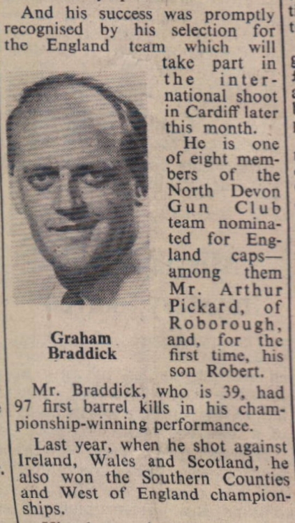 Bideford businessman Graham Braddick, to use his own words has been ‘shooting dreadful’ this season. But at the weekend he regained the touch which won him his second England cap last year and carried off the English down-the-line clay pigeon championship at Stoke Orchard, Cheltenham. Among the marksmen behind him in the ratings was Staffordshire’s Brian Bailey, who is in Britain’s Olympic team. Mr Braddick lives at Greenover, Limers Lane, Northam.