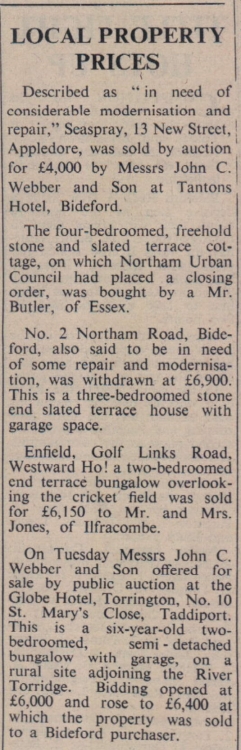Local property prices – Seaspray, 13 New Street, Appledore; No. 2 Northam Road, Bideford; Enfield, Golf Links Road, Westward Ho!; and No. 10 St Mary’s Close, Taddiport.
