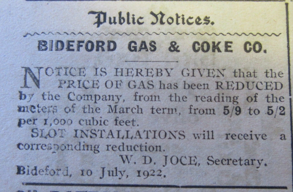 The Secretary of the Bideford Gas & Coke Co. W D Joce, advises that the price of gas has been reduced.