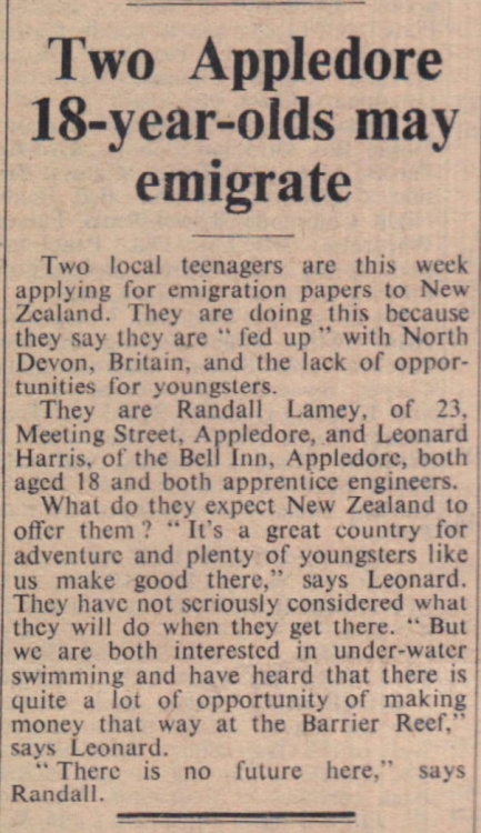 Did Randall Lamey, of 23 Meeting Street, and Leonard Harris, of the Bell Inn, Appledore, emigrate to New Zealand?
