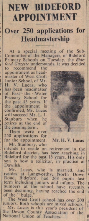 New Bideford appointment as over 250 applicants apply for headmastership. Mr H V Lucas is appointed headmaster of West Croft Junior School after 13 years at East-the-Water Primary School.