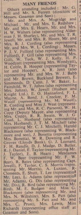 Fellow employees at Messrs Goaman and Son, where he had been employed for 35 years, were bearers at the funeral of Mr Charles Arthur Waldon, of 28 Royston Road, Bideford, who died aged 65. Mr Waldon was the husband of Mrs Olive Waldon. The Rev R H Foster officiated at the funeral service. Immediate mourners attending included: the widow and son; Hazel and Hilda, daughters-in-law; Mr and Mrs A E Waldon, brother and sister-in-law; Mrs A Pearce and Mrs B Worth, sisters; Mr and Mrs J Jennings, Miss D Sing, Mr and Mrs R Sing, Mr W Eastman, brothers-in-law and sisters-in-law; Mr and Mrs S Waldon, Mrs J Backway, Mr R dyer, Mr and Mrs A Tricker, Mr E Mountjoy, Mr C Mountjoy, nephews and nieces. Mrs R Brown and Miss B Hockin were unavoidably absent. The bearers were Messrs Jennings, Pengelly, Trott, Pennington, Woolf and Taylor.