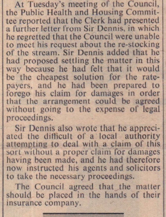 Sir Dennis Stucley is to sue Bideford Rural Council, of which he is Chairman, for damages because he alleges that pollution from the Council’s drainage system at Hartland has ruined the trout fishing in Hartland Abbey stream. Sir Dennis estimates that the cost of re-stocking the stream with trout ‘on the lowest scale’ would be £50.