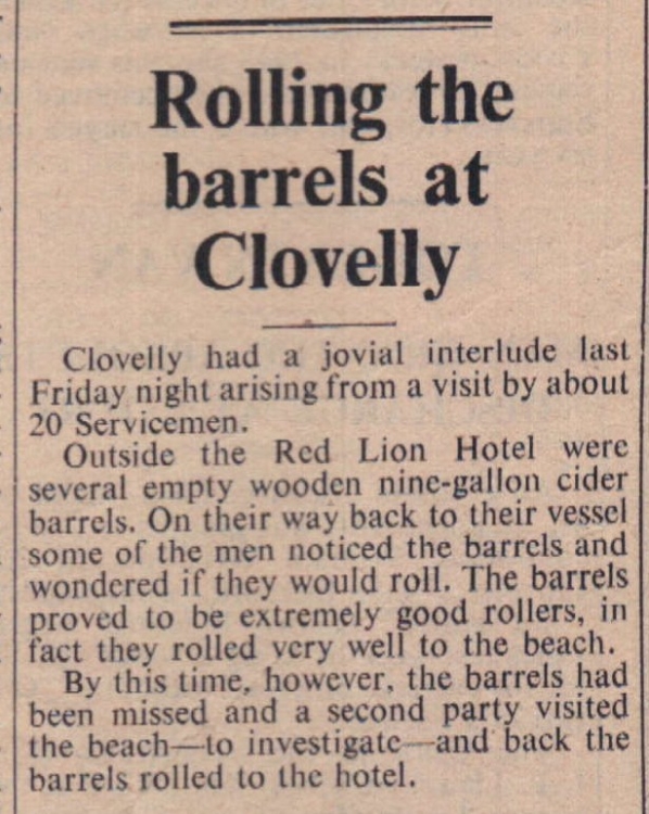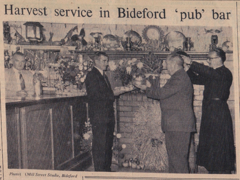 For the first time, a harvest service was held in the bar of the Ship-on-Launch Inn, at East-the-Water, Bideford. The bar was decorated with produce, including poultry and fruit, and 120 people attended the bar service at 8pm. The produce was given by customers of the inn. The Rev W T Brewster, of St Peter’s Church, conducted the service and Post Office employee, Mr Douglas Bliman, read the lesson. “The only criticism customers had to make was that the half-hour service was too short” said Mr A Bond, the licensee.