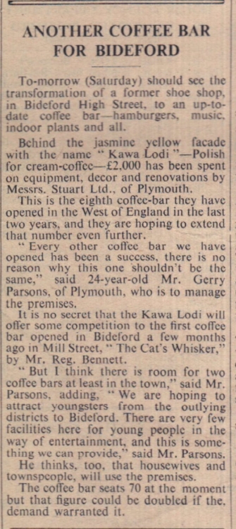 Bideford is to have another juke-box coffee bar. Mr John Bernard Frost has been granted a music licence for 62 High Street, Bideford. Mr Reg Bennett, who recently opened Bideford’s first coffee bar – The Cat’s Whisker - and was only granted a six-day music licence, will now apply to extend it. Later in the month, Kawa Lodi, - Polish for cream-coffee – was opened.