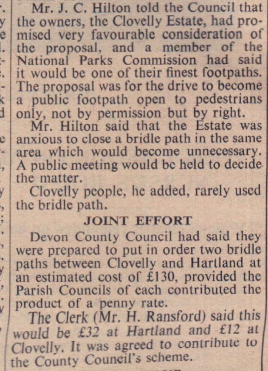 The possibility of the famous Hobby Drive, leading from the main Bideford-North Cornwall road to Clovelly, becoming a public right of way was discussed by Clovelly Parish Council.