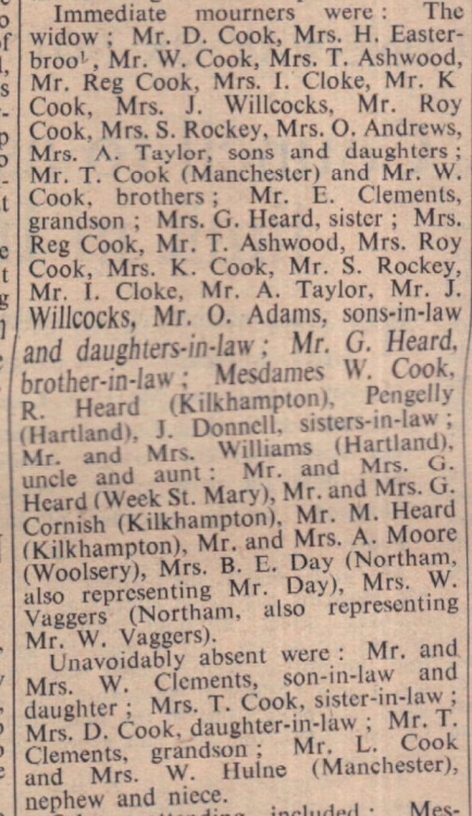 Many friends attended the funeral service at All Saints’ Church, Clovelly, of Mr Daniel Cook, of 114 Sierra, Higher Clovelly. Born at Blegberry, Hartland, Mr Cook, who was 72, head lived at Clovelly for the past 45 years. For 35 years he worked for the Clovelly Estate Co Ltd. The Rector, Rev R O H Eppingstone, officiated at the funeral service. At the organ, Mr R Fisher accompanied the singing of hymns.
