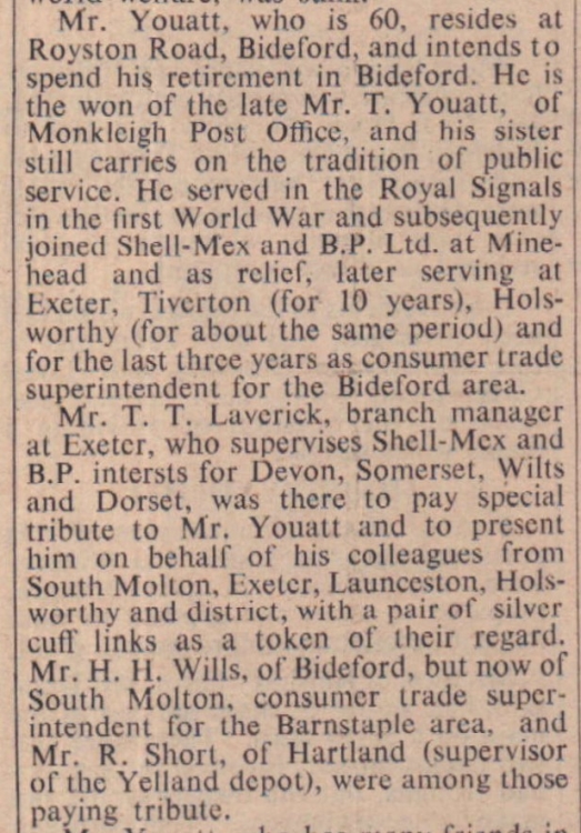 Fellow members of Shell-Max and BP Ltd from Exeter, South Molton, Bideford and Launceston gathered round at the New Inn Hotel, to lunch and to show their personal appreciation of Mr J E Youatt, a Monkleigh man, who was retiring after 30 years with the Company. Important anniversaries coincided with the event for it was only last week that Mr Youatt celebrated his silver wedding.