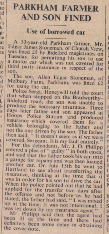 Car abandoned by a former airman on the Council’s car park at Hartland is still providing Bideford Rural Council with a headache. At Tuesday’s meeting the Health and Housing Committee stated that the Clerk had reported on what he was proposing to di to have the car removed. A local member had said that an individual had told him that he would be prepared to pay for the parts of the vehicle as spares, but it also appeared that the car had not been fully paid for. Contrary to the views of the Clerk, the Committee stated, they recommended that offers for the car should be invited by means of an advertisement in the local paper. The Finance and General Purposes Committee recommended that the owner be informed that the Council were removing the car to the Philham refuse dump, Hartland, at his sole risk, and that they would claim the cost of so doing for him.