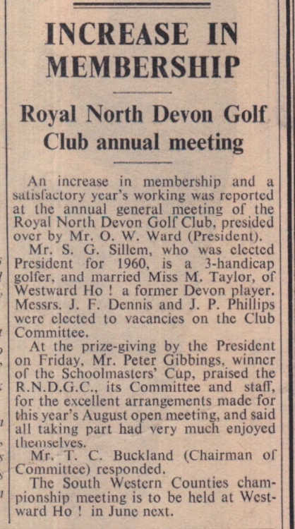 Mr O W Ward presides over the annual general meeting of the Royal North Devon Golf Club, and Mr S G Sillen is elected President for 1960.